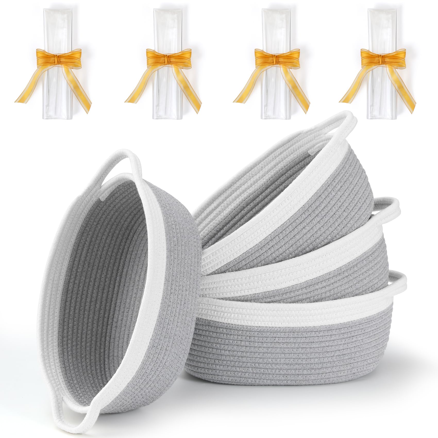 4 Pack Small Woven Basket with Handles, Cotton Rope Room Shelf Storage Basket, Cute Baby Gift Basket for Nursery, Bedroom - Cat Dog Toys Basket, Empty Decorative Gift Chest Box, All 12"x 8"x 5",Grey