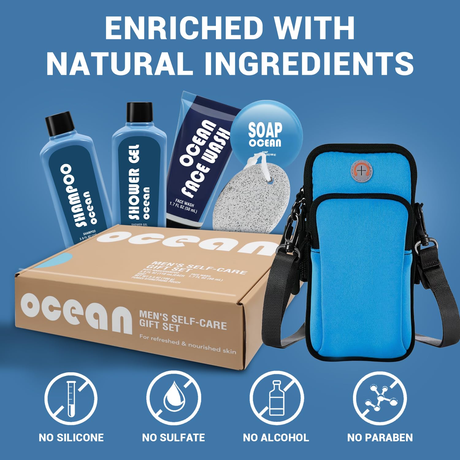 - Gift Baskets for Men: This portable 6-piece bath set for men includes all essentials to recover and revitalize post-workout: shampoo, shower gel, face wash, soap, phone pouch, and pumice stone.