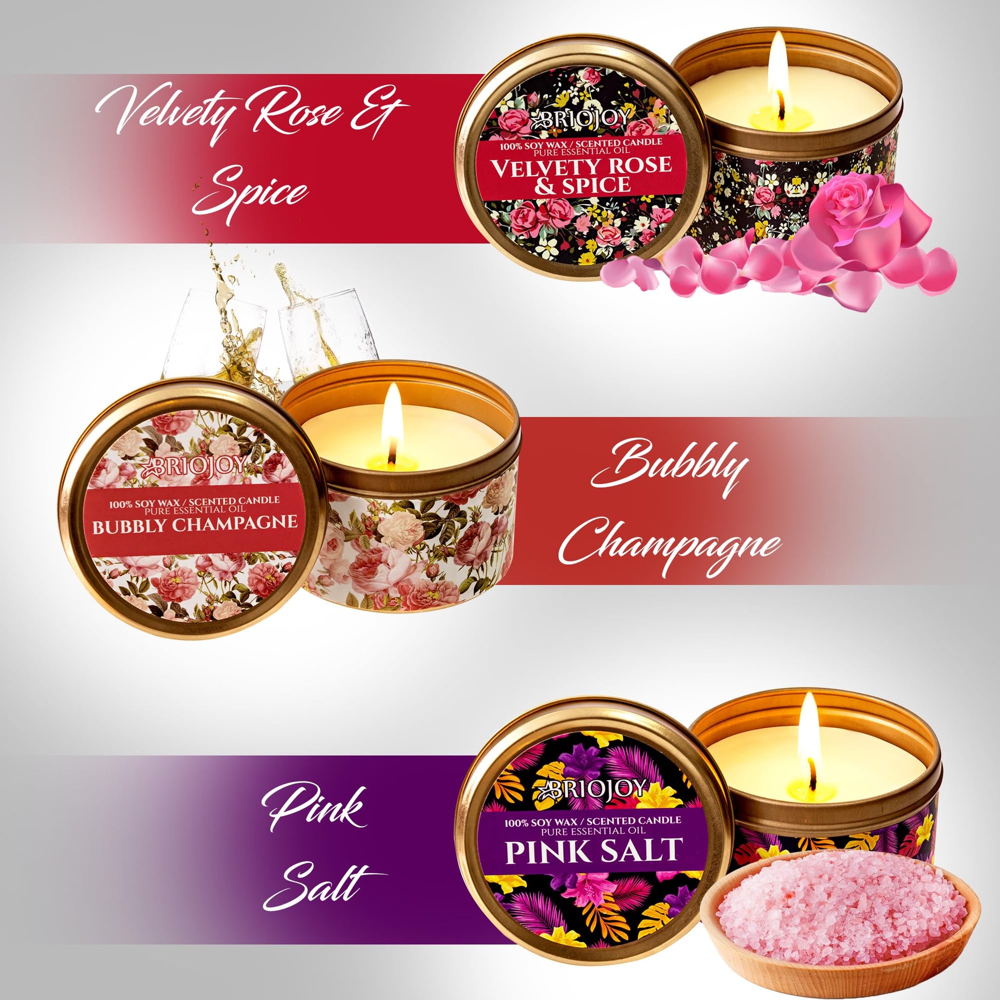 - 🌺 SWEET AND UNIQUE SCENTS: Add a soothing effect and create a cozy and intimate atmosphere in your space with our romantic candles that come in pink salt, bubbly champagne, and velvety rose & spice scents. Each 3-6 ounce essential oil candle burns for 30-35 hours—a total of 90-105 hours of restorative fragrance.