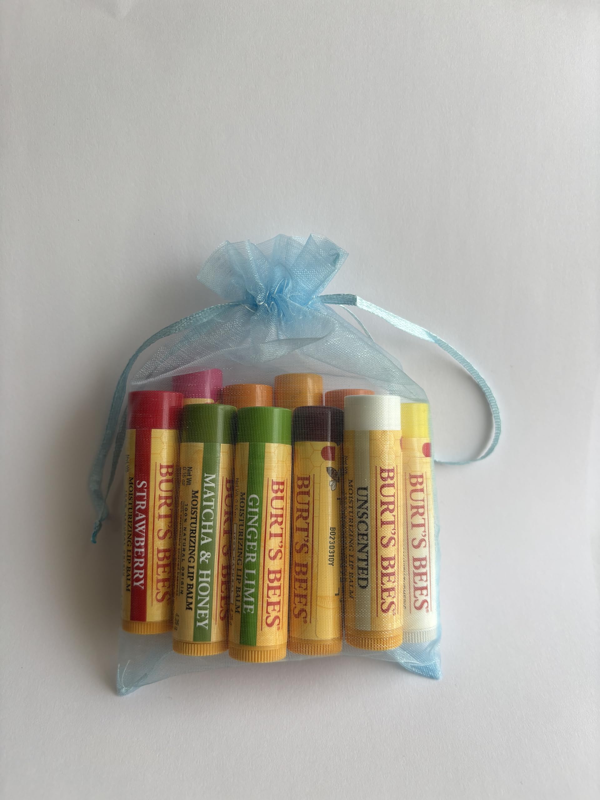 Details: 10 Pack Burt's Bees Lip Balm mix pack. 10 differnt flavors picked at random. Makes a great gift and perfect stocking stuffer. Drawstring gift bag included.