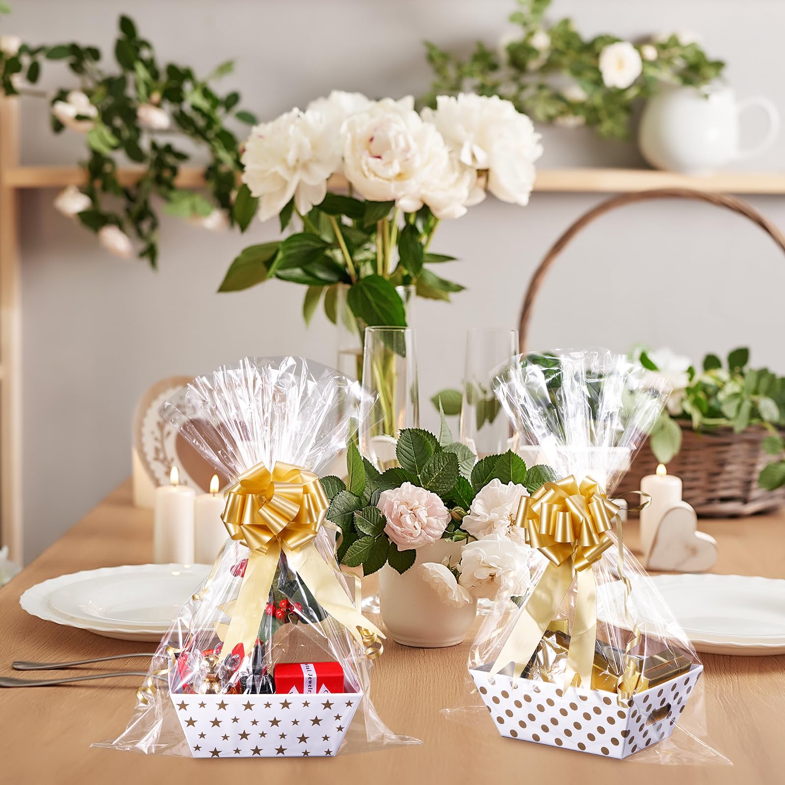 - Gift Basket Kit: includes 12 golden basket for gifts empty, 20 clear gift bags, and 18 gold pull bows; This thoughtful combination simplifies the process of packaging and decorating your Christmas gifts, catering to your needs for convenience and practicality