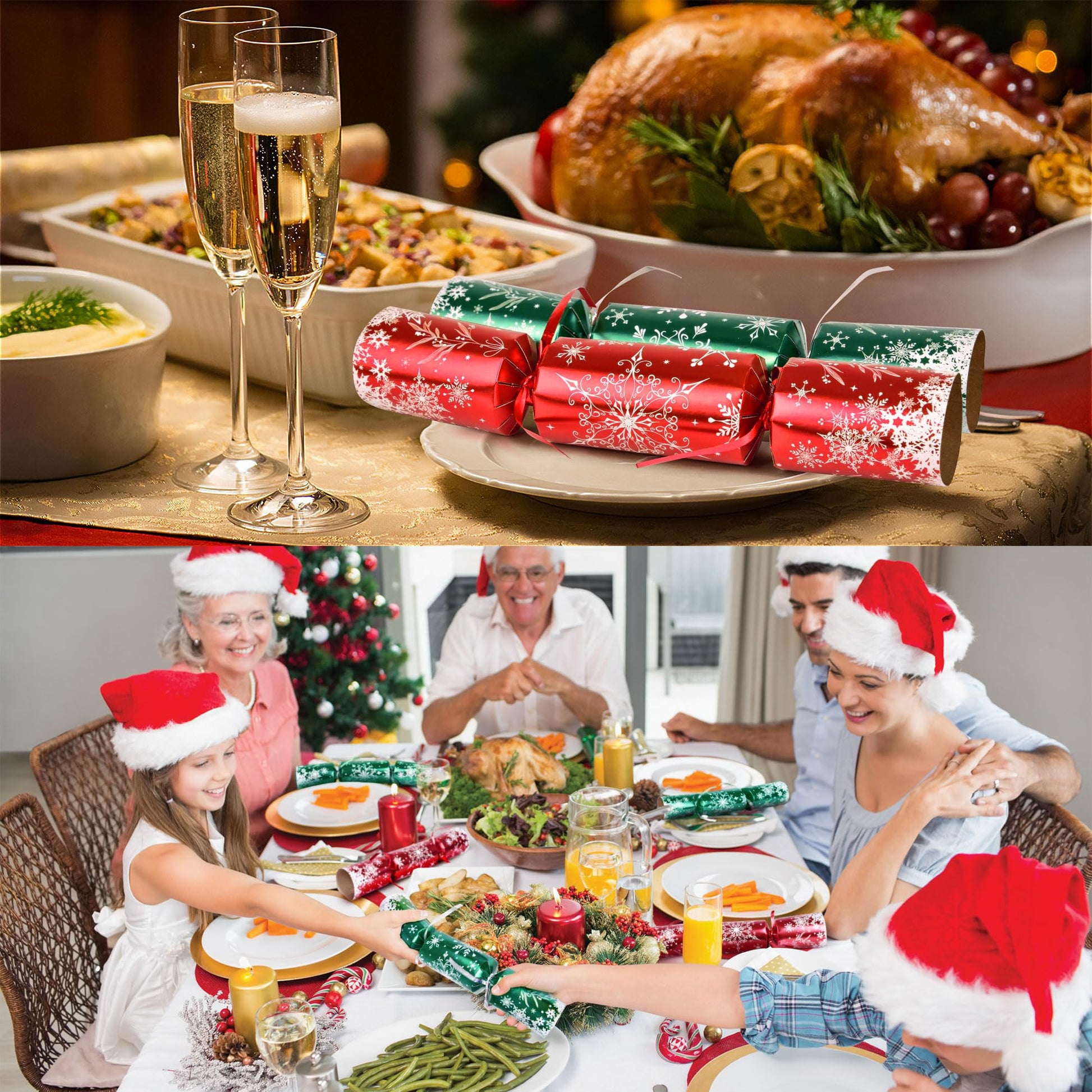 Christmas Crackers, 12 Pack Valentines No Snap Party Favors with Party Hat, Joke & Little Gift Inside for Christmas Thanksgiving Seasonal Holiday Dinner Traditions (Red and Green)