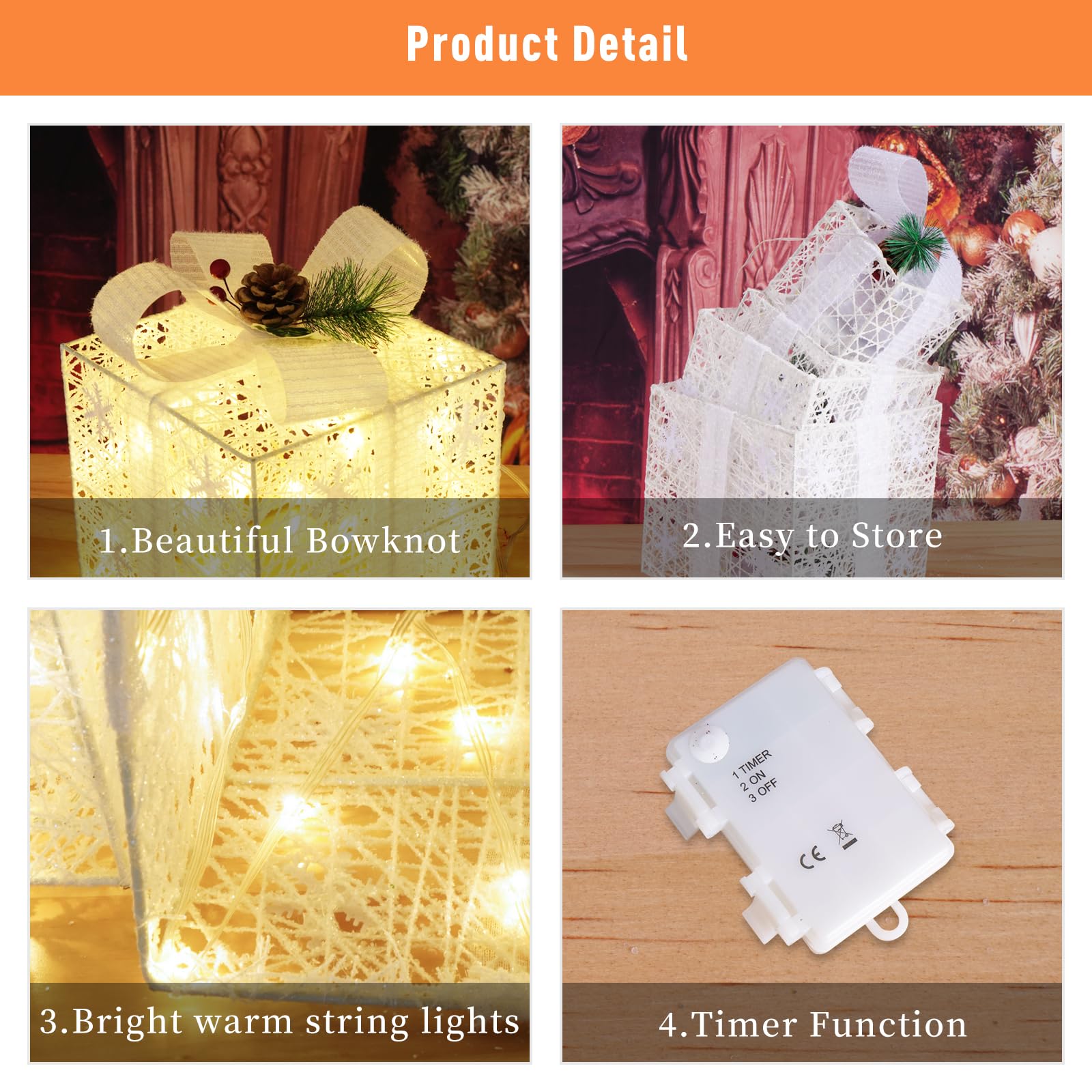 - TIMER FUNCTION: The built-in timer function ensures that your gift boxes will automatically turn off after 6 hours to save energy. Warm white LED lights are embedded in each gift box, making them the perfect addition to your Christmas decorations at night