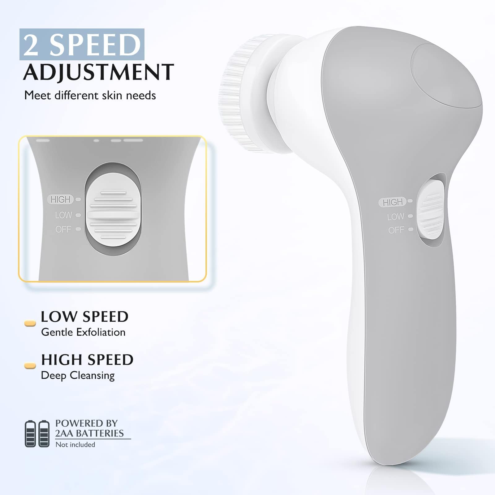 - PREMIUM WATERPROOF AND SAFE DURING SHOWER: This facial exfoliating brush is IPX7 waterproof, making it safe to use in the shower. For the facial cleansing brush to last, we sincerely recommend that you keep the battery compartment dry and do not submerge the entire portable facial brush in water ; Does not include 2 AA batteries