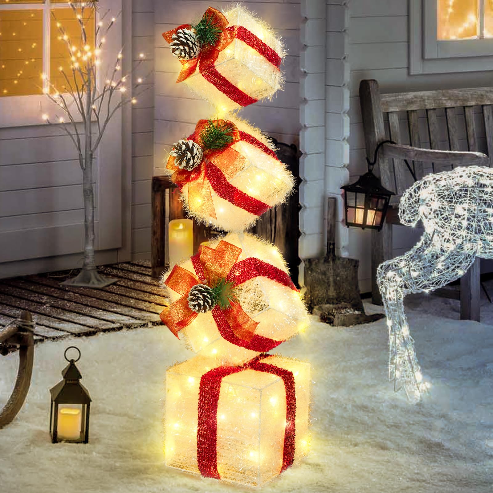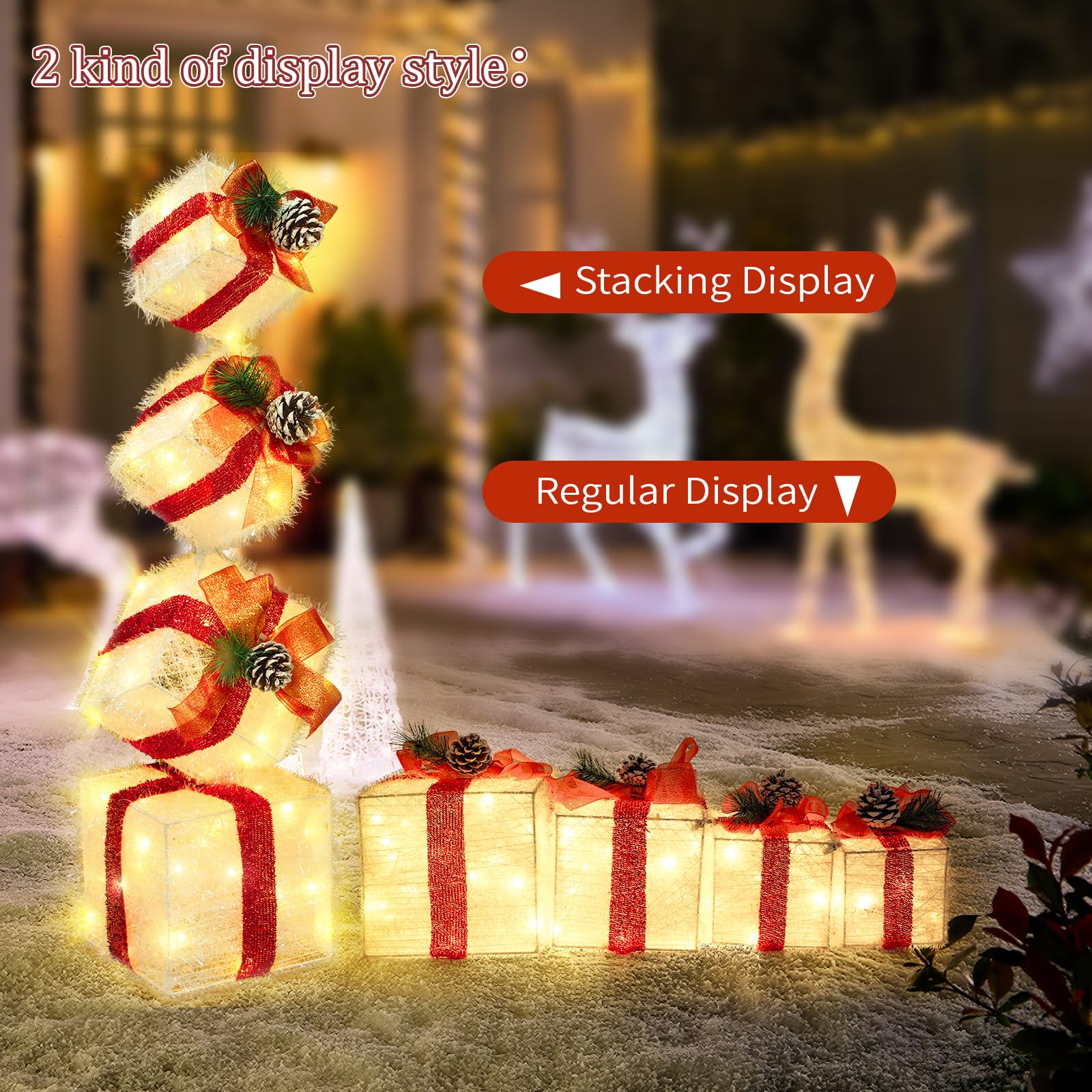 - Versatile Holiday Display: These lighted gift boxes offer 2 arrangement options - display side-by-side or stack up to 3.6ft tall. Perfect for tabletops, mantels & parties, they bring festive cheer with warm glowing lights. Set of 4 beautifully decorated boxes for stunning holiday decor