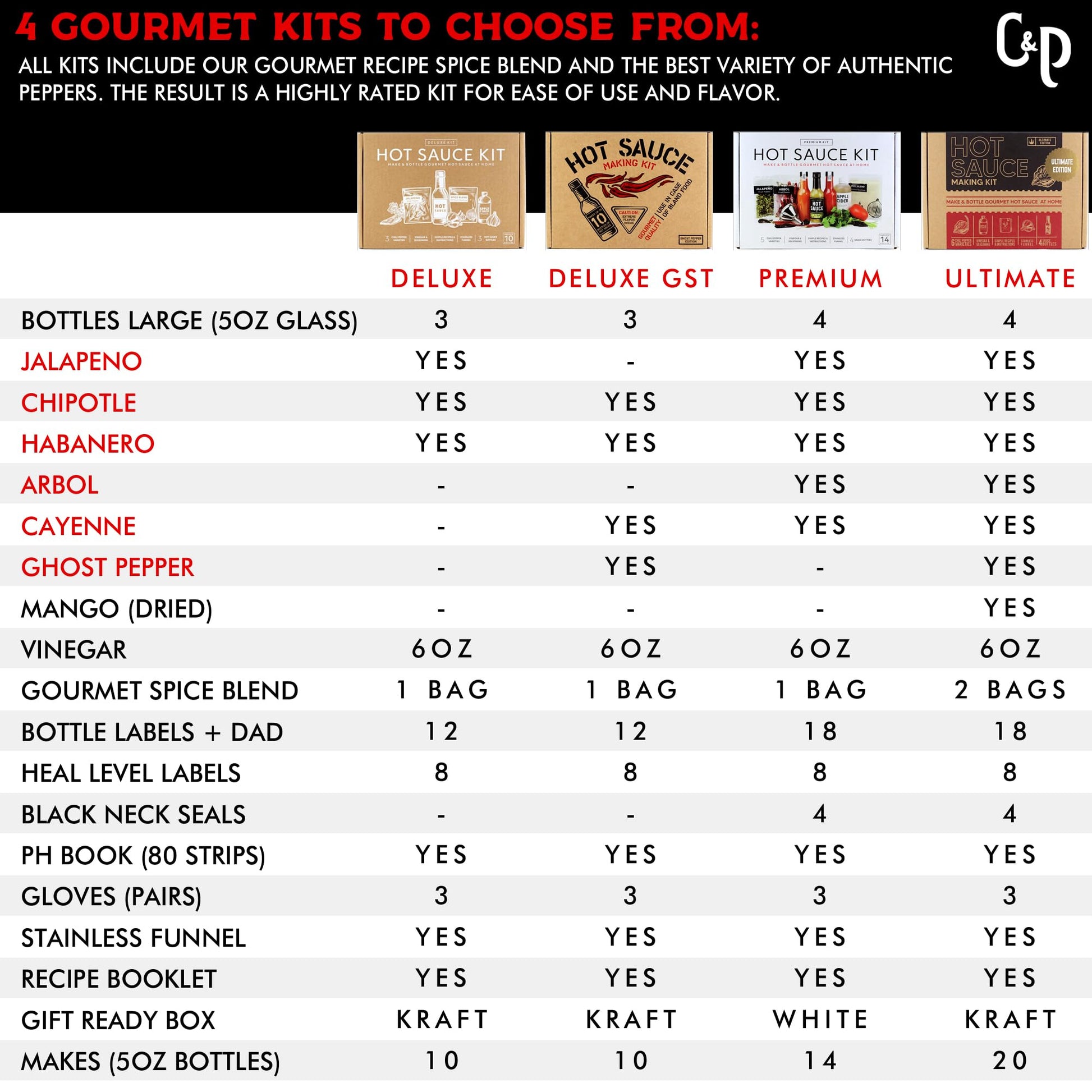- Dad labels now included! (Deluxe Ghost Kit) includes 4 Pepper Varieties: Chipotle, Habanero, Cayenne, Ghost Pepper. Everything you need to make and bottle gourmet hot sauce. Makes up to 10 bottles. Premium Glass, Stainless funnel Gourmet Spice Blend. Designed to be easy to make. Hightly Rated. The perfect gift for dad.
