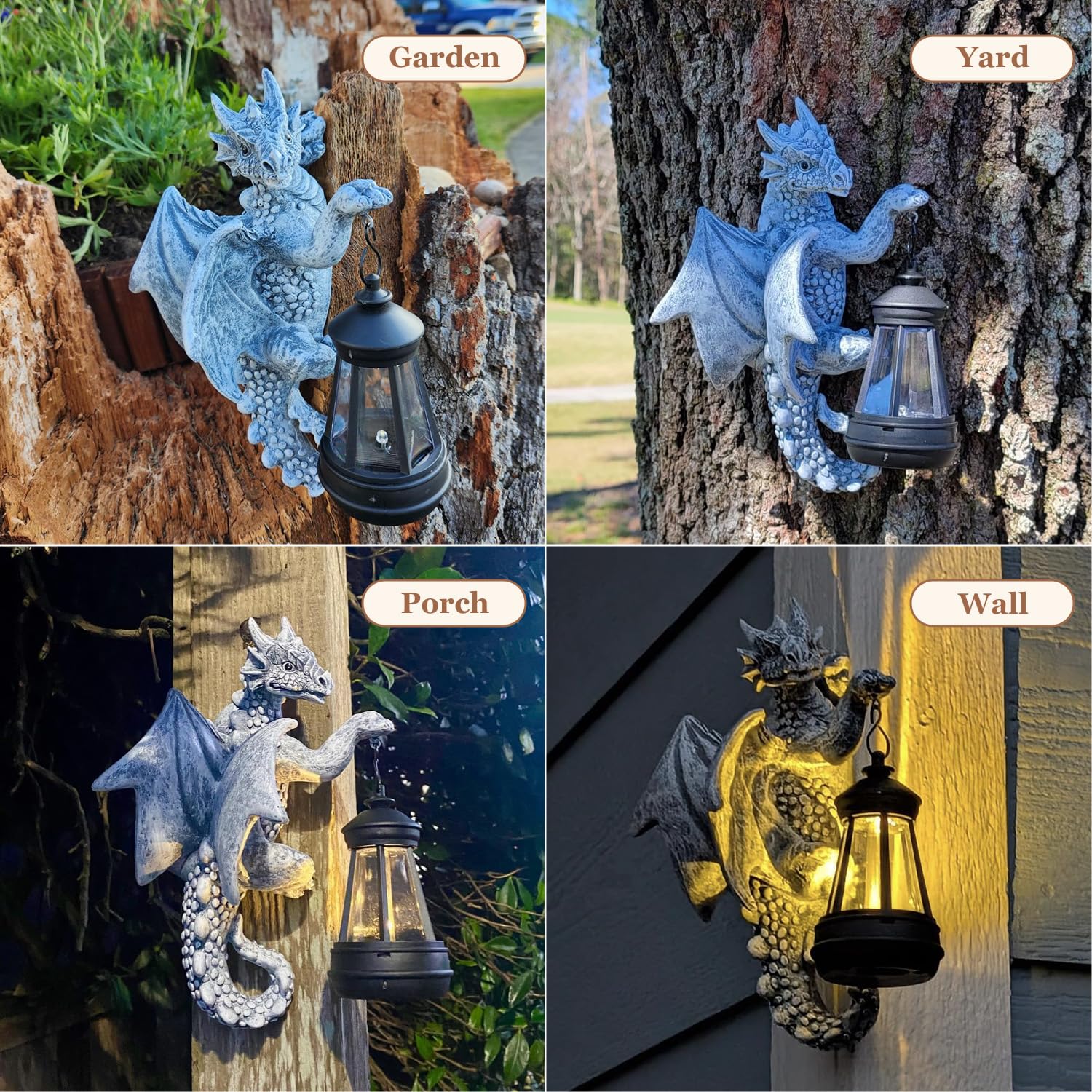 Dragon Tree Hugger Solar Garden Decor - 9.3 Inch Garden Statues Lawn Ornaments for Outside Balcony Yard Whimsical Art Outdoor,Medieval Fantasy Halloween Decor