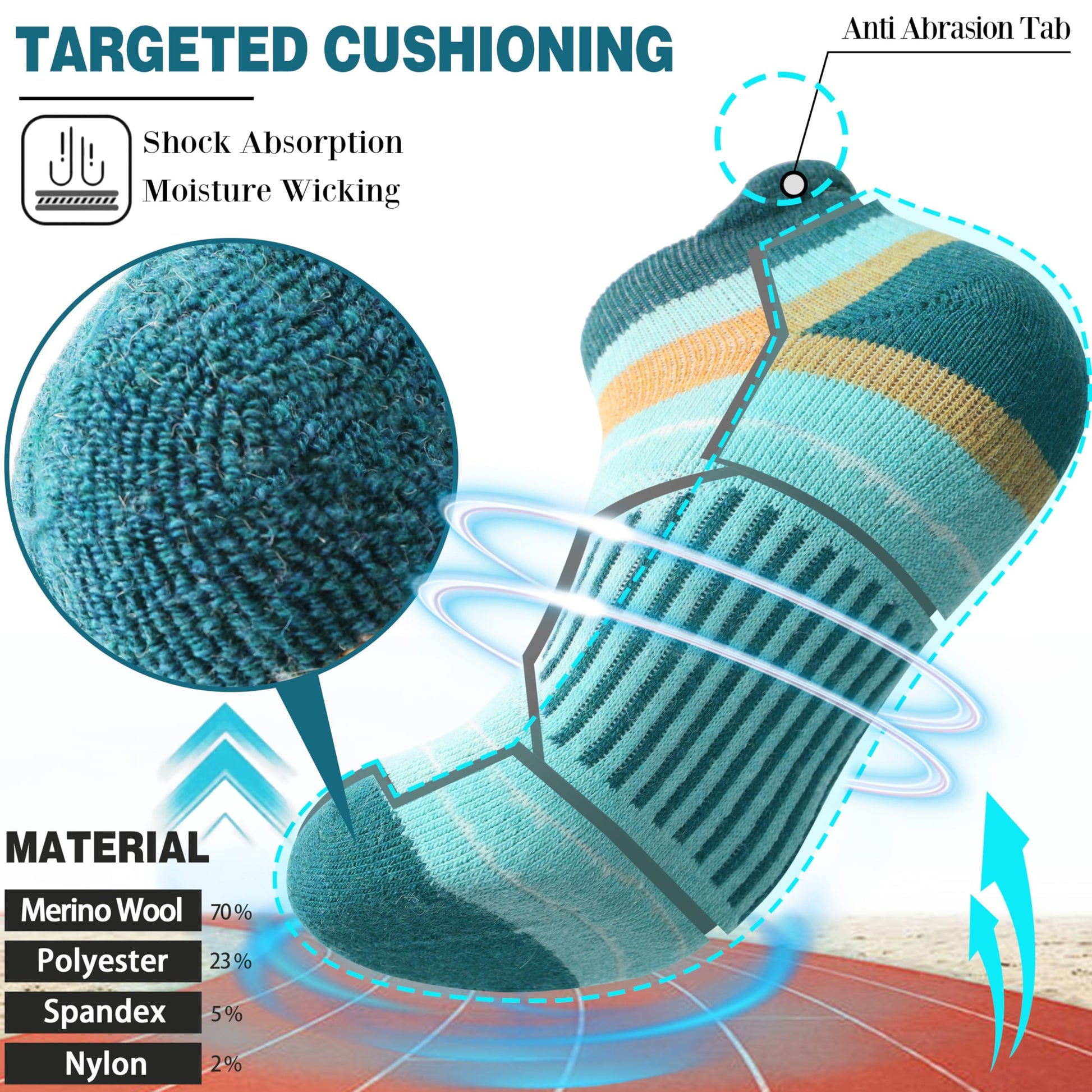 - COMPRESSION SUPPORT- Targeted compression stripes can protect your achilles and reduce plantar fasciitis. High elastic fabric can enhance the blood moving, relieve symptoms varicose and keep socks stable. Anti abrasion tab prevents socks from slipping. These merino wool socks can greatly improve your comfort in hiking, running, walking, climbing, trekking or everyday wear.
