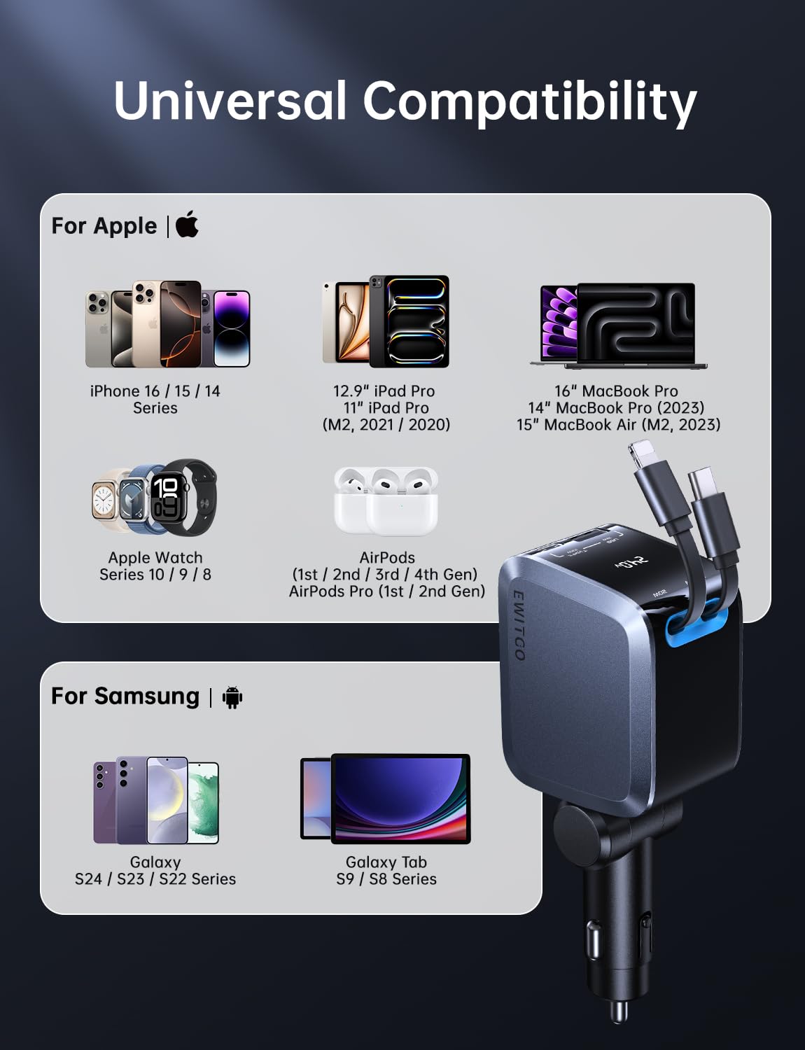 - 4-in-1 Retractable Car Charger: EWITGO 4 in 1 retractable car charger features two built-in retractable cables, including a 20W USB IP cable for Apple devices and a PD 30W USB C cable for modern Android smartphones. The retractable cables extends up to 31.5 inches, allowing smooth length adjustment to any position and automatically retracting, keeping your car neat and tangle-free. Additionally, it includes a USB A port and a USB C port, enabling you to charge up to four devices simultaneously