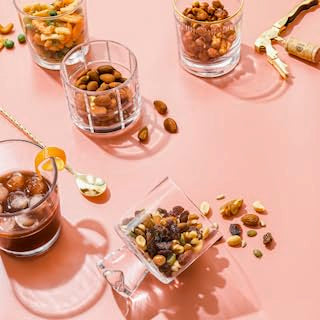 - GREAT ASSORTMENT Slip off the ribbon, open the latch, and be dazzled by a gourmet assortment of treats including Salted Pistachios, Salted Nut Mix, Honey Mustard Pretzel Mix, Spicy Pub Blend, Praline Peanuts and a Cranberry Health Mix.