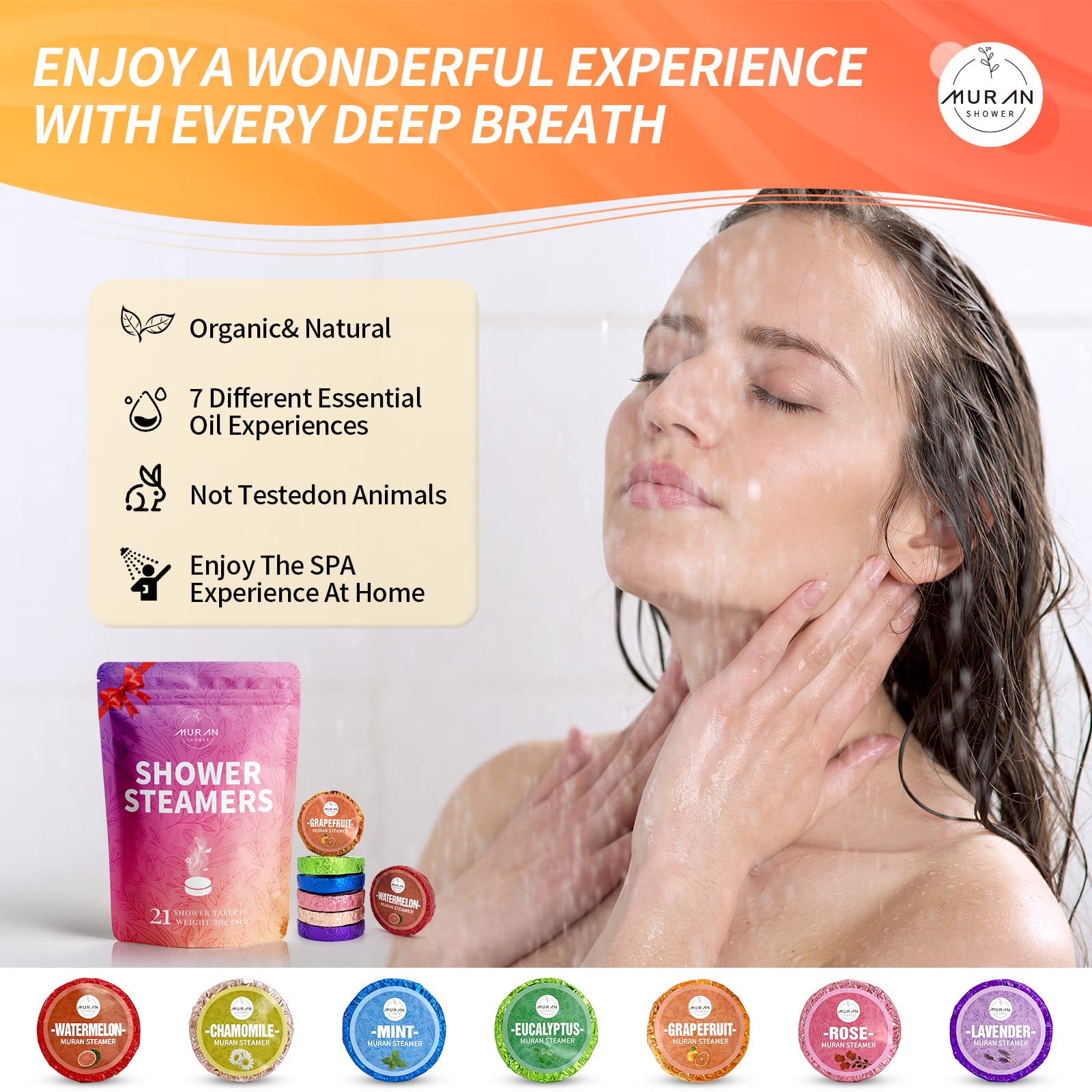- [New upgraded experience, definition of aromatherapy] For the best shower experience, we have researched many shower bombs on the market and upgraded and improved their scent, shape, and size, MURAN shower steamers are naturally fragrant, it allows you to take a slow deep breath and enjoy every moment of relaxation, try this home spa set now