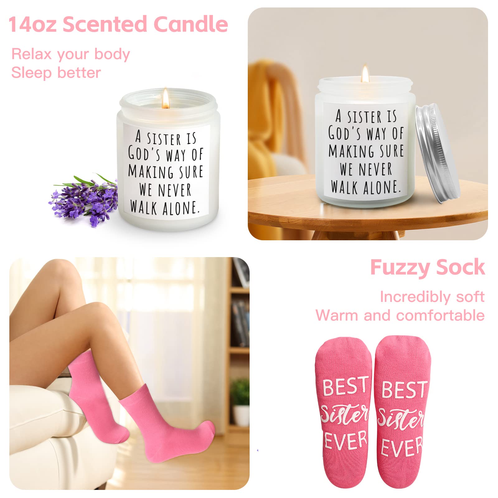- Sister theme Candle and Poster: Remind her you love her so much, her smile grow as she reads the words 'A sister is God's way of making sure we never walk alone' Get the newly sister birthday gift that will really wow her. Big Sister Gift: This sister gifts are attractively packed for an amazing unwrapping experience. Girl's face will light up with delight as she opens this. This gifts for sister also will bring her a luxurious & sublime home spa experience