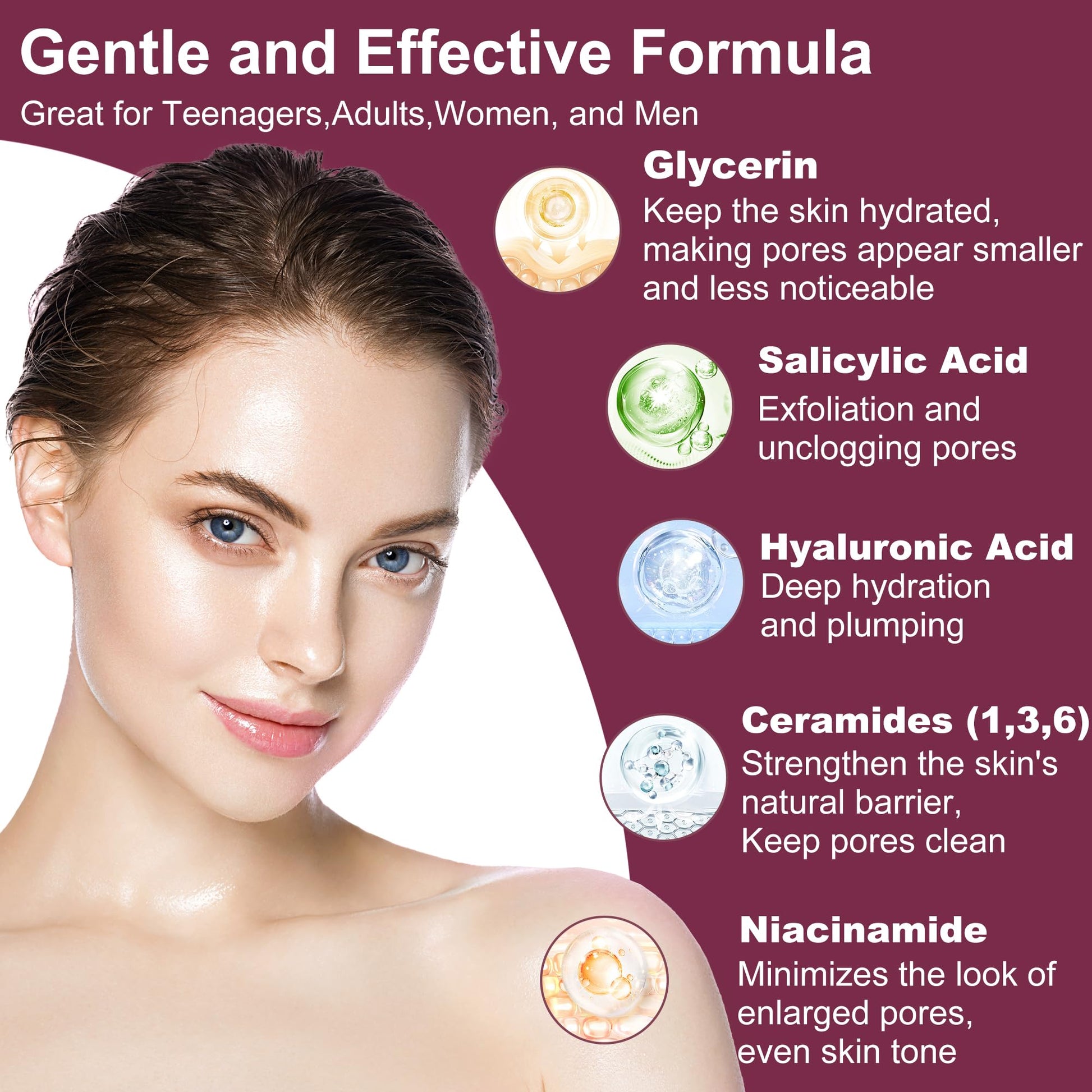 - Refines Pores and Reduces Blackheads: Powered with Hyaluronic Acid,Salicylic Acid,3 Ceramides,and Glycerin,Our sulfate free skincare products provide hydration without causing dryness and irriation,exfoliate and clear blackheads for a flawless, smooth texture