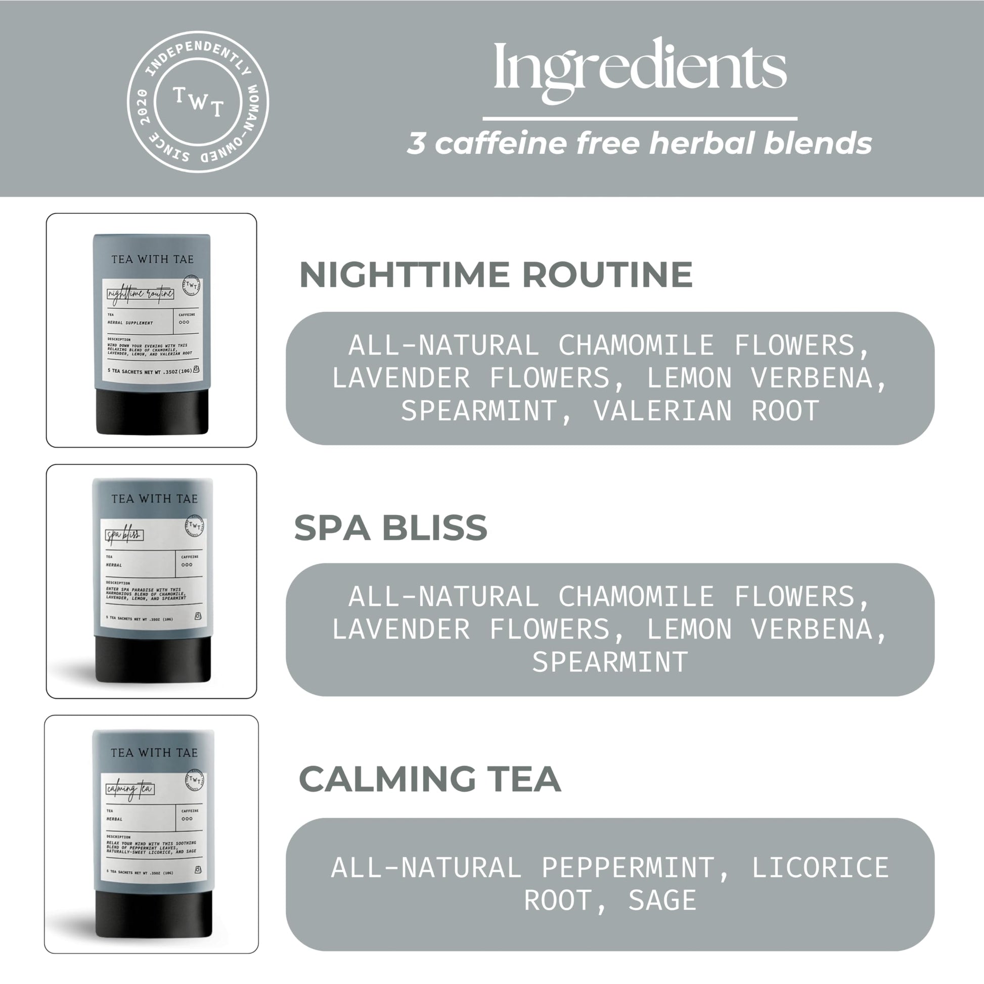 - 3 CAFFEINE FREE BLENDS: Nighttime Routine, Spa Bliss, Calming Tea