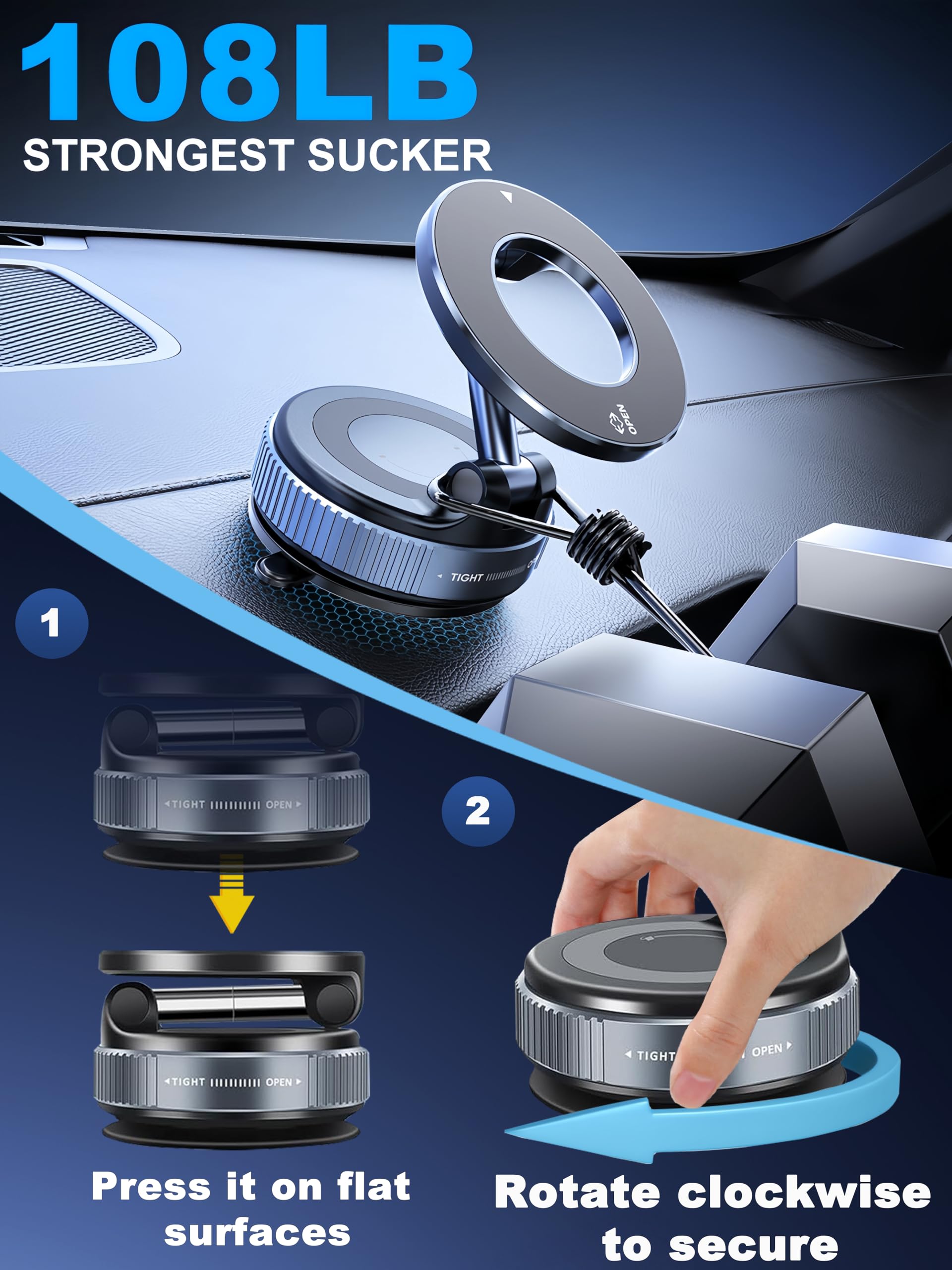 - 【Strong Suction】This vacuum magnetic phone holder features an upgraded 4-layer nano gel suction base with rotary vacuum-seal technology. Simply twist the dial to secure it firmly on flat surfaces like leather dashboards, windshields, center consoles, or side windows. Delivers 80% stronger hold than traditional push-style mounts, staying rock-solid even on bumpy roads. (Pro tip: Rinse the suction cup with water to restore its original grip if adhesion weakens).