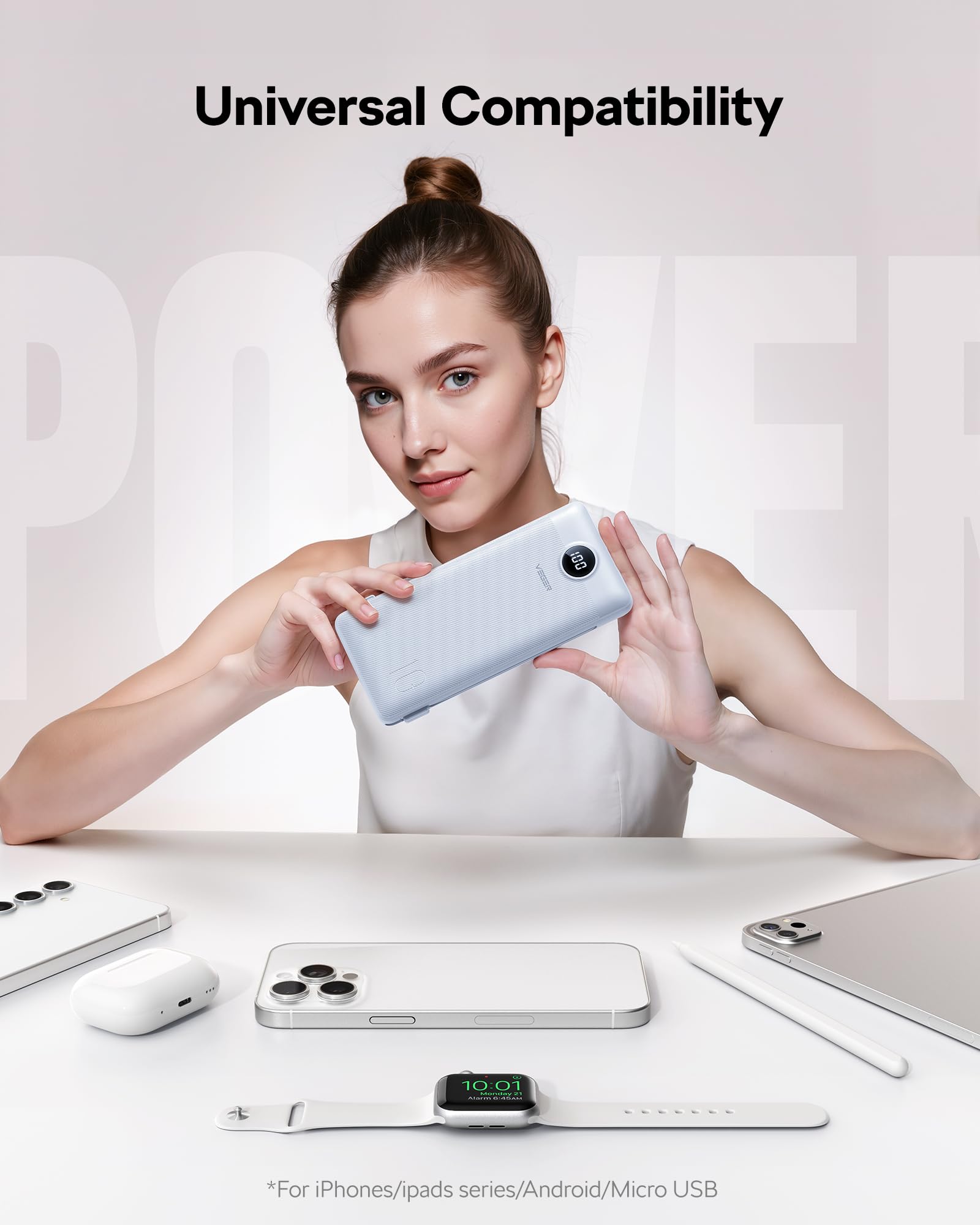 - Universal Compatibility: The battery pack is widely compatible with iPhones, iPads, Apple Watches, AirPods, Samsung Galaxy devices, Google Pixel, LG, and more. The built-in Micro USB cable and low-current mode also support small devices like smartwatches, headphones, and desk fans.