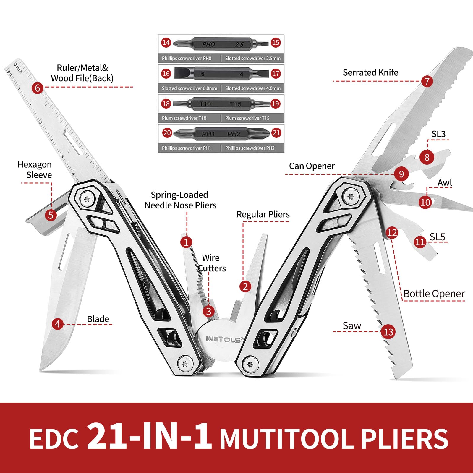 WETOLS Multitool with Pocket Knife, Birthday Gifts for Men Women Mom Dad, 21-in-1 Stainless Steel Pliers with Screwdrivers, Self-locking Multi tools with EDC Sheath, Ideal for Home, Camping, Survival
