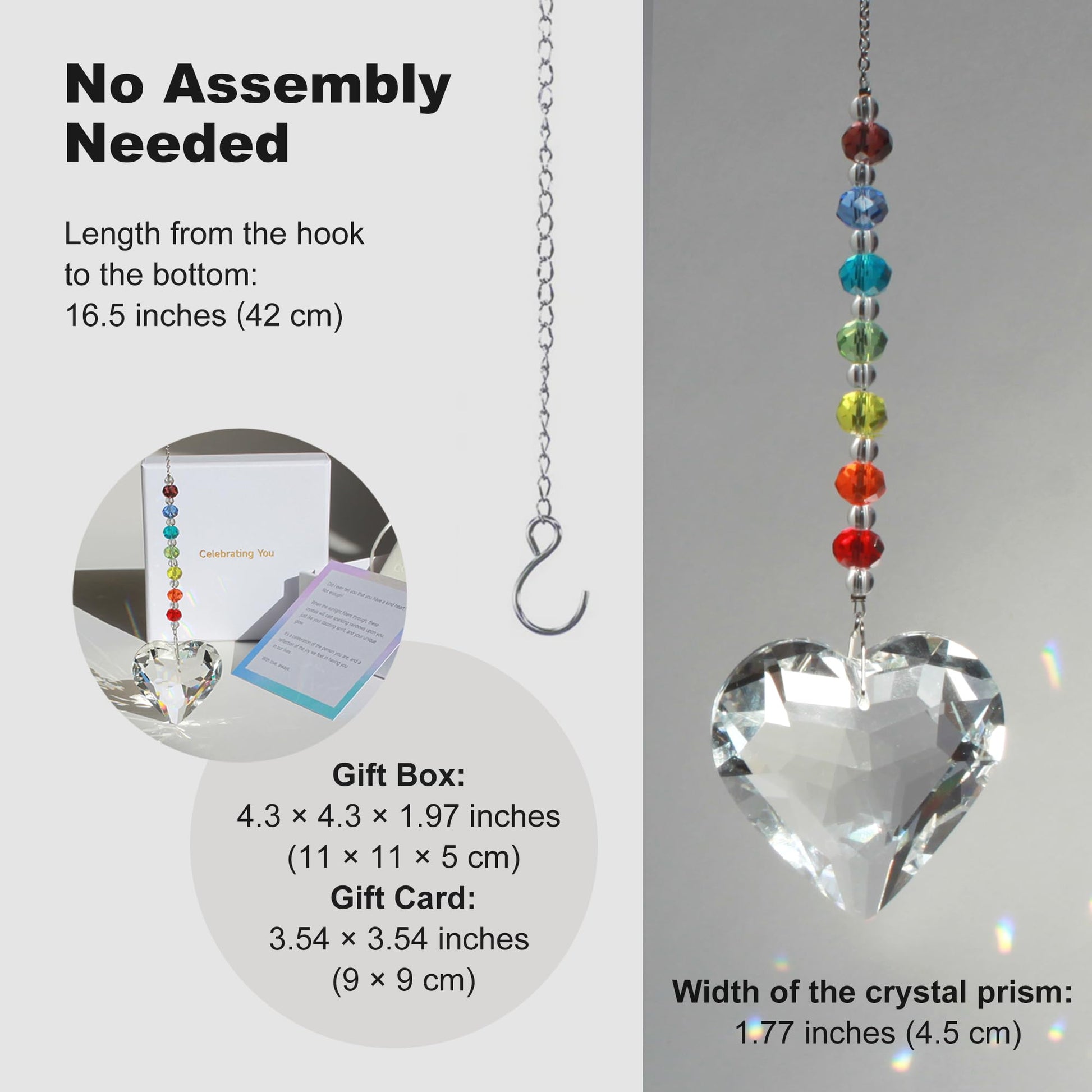 • Clear and Well-cut K9 Crystal Heart, Stainless Steel Chain & Hook, Exquisite Craftsmanship - No assembly needed; hang it as an elegant home decor piece by the window or use it as an enchanting outdoor ornament in the garden or yard. Dimensions: Gift Box - 4.3 x 4.3 x 1.97 inches (11 x 11 x 5 cm); Gift Card - 3.54 x 3.54 inches (9 x 9 cm). The ornament/suncatcher: Length from the hook to the bottom: 16.5 inches (42 cm); Width of the crystal prism: 1.77 inches (4.5 cm)