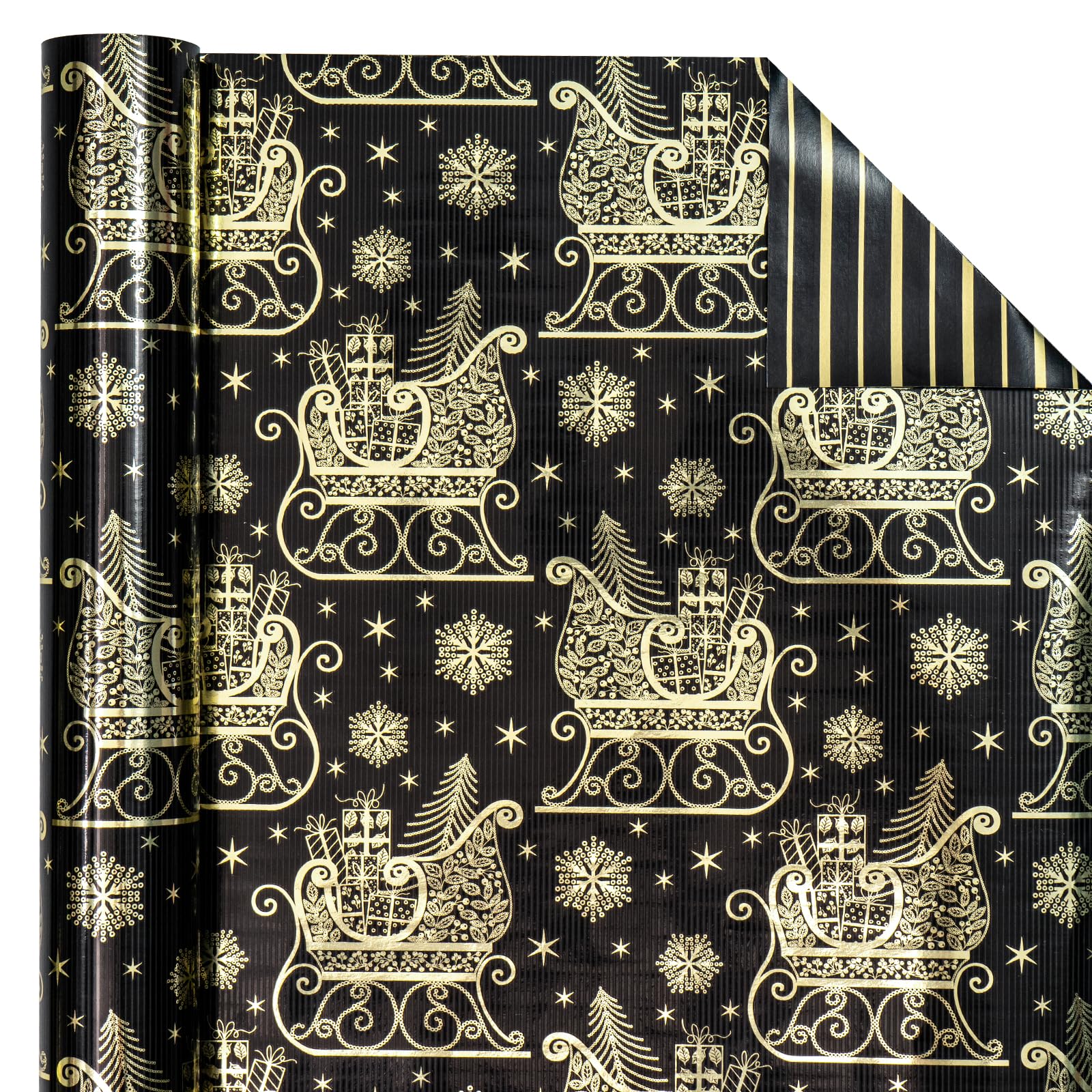WRAPAHOLIC 30 Inch Jumbo Reversible Black and Gold Christmas Wrapping Paper - 30 Inch x 33 Feet - Black Gold Sleigh and Stripe Wrapping Paper with Metallic Foil for Christmas, Holiday, Party