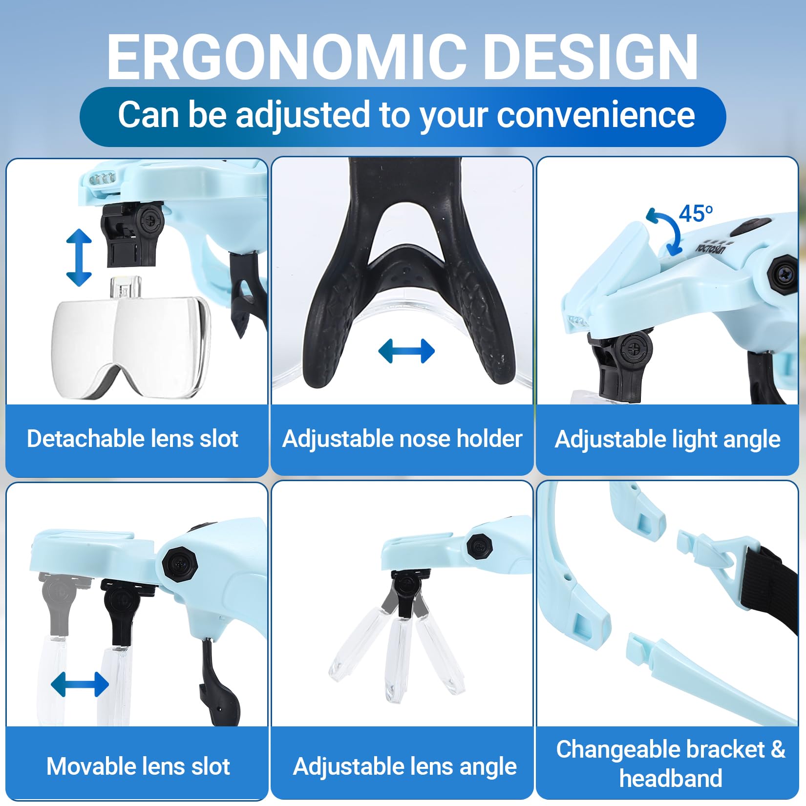 • Adjustable LED Magnifying Glasses; The light mount on the magnifying visor can be adjusted to change the angle of light to suit the task at hand.The lens angle and lens distance is also adjustable.