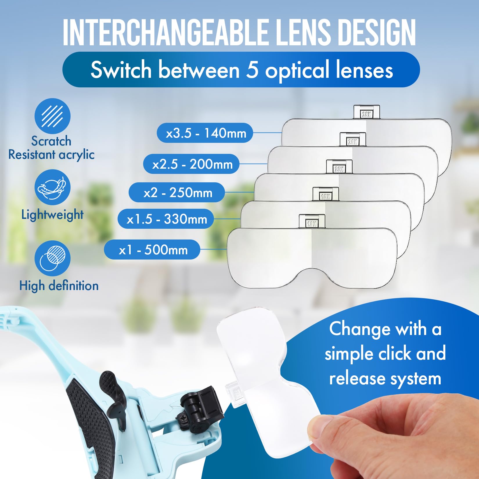 • Interchangeable Lens Design: Switch between 5 optical lenses using a simple click and release system. Magnification power of the head magnifier: 1.0X, 1.5X, 2.0X, 2.5X, 3.5X. Scratch-resistant acrylic reduces weight. All lens come in a sturdy storage box to keep them organized and protected.